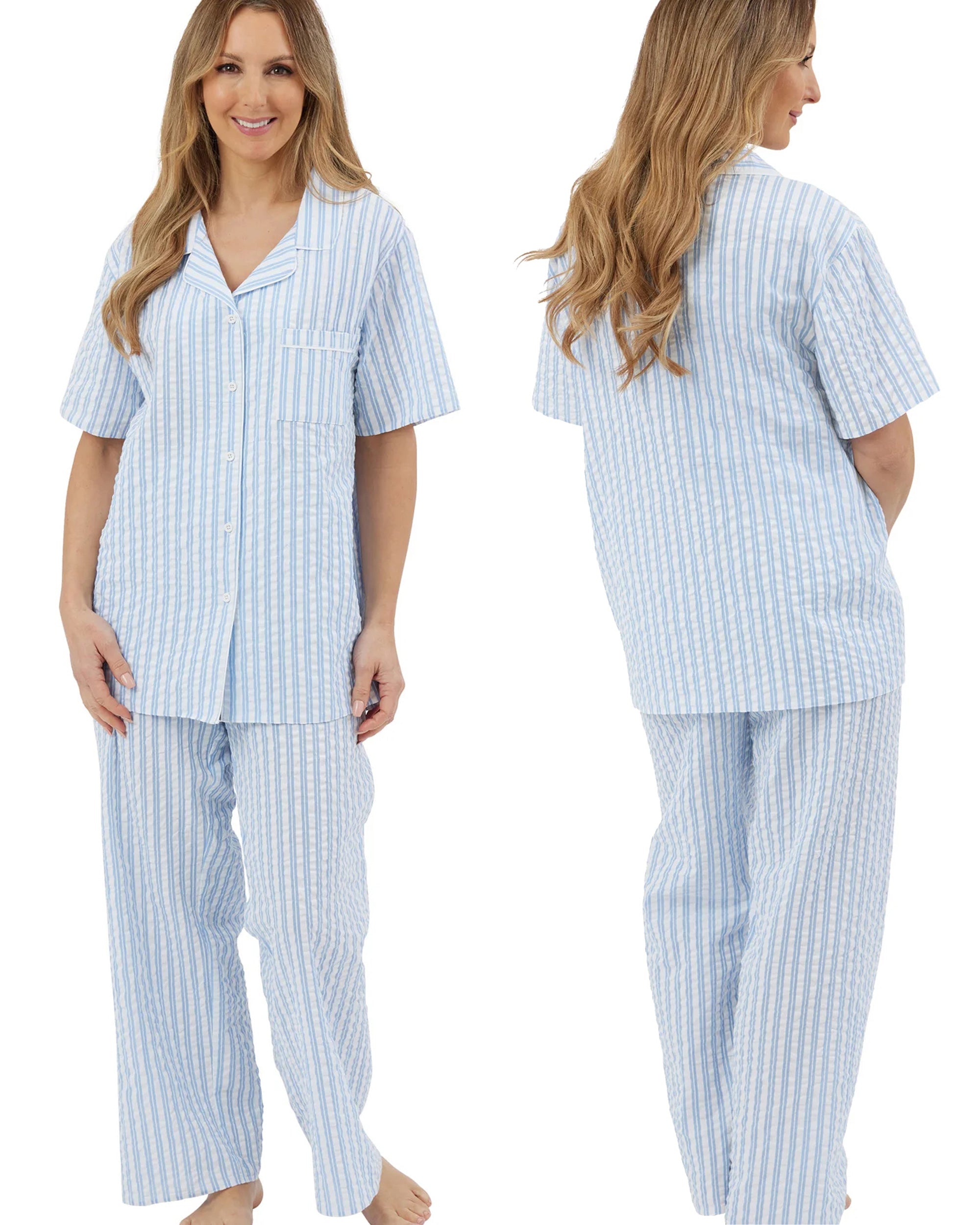 Blue 'Coastal Stripe' 100% cotton seersucker short sleeve pyjamas