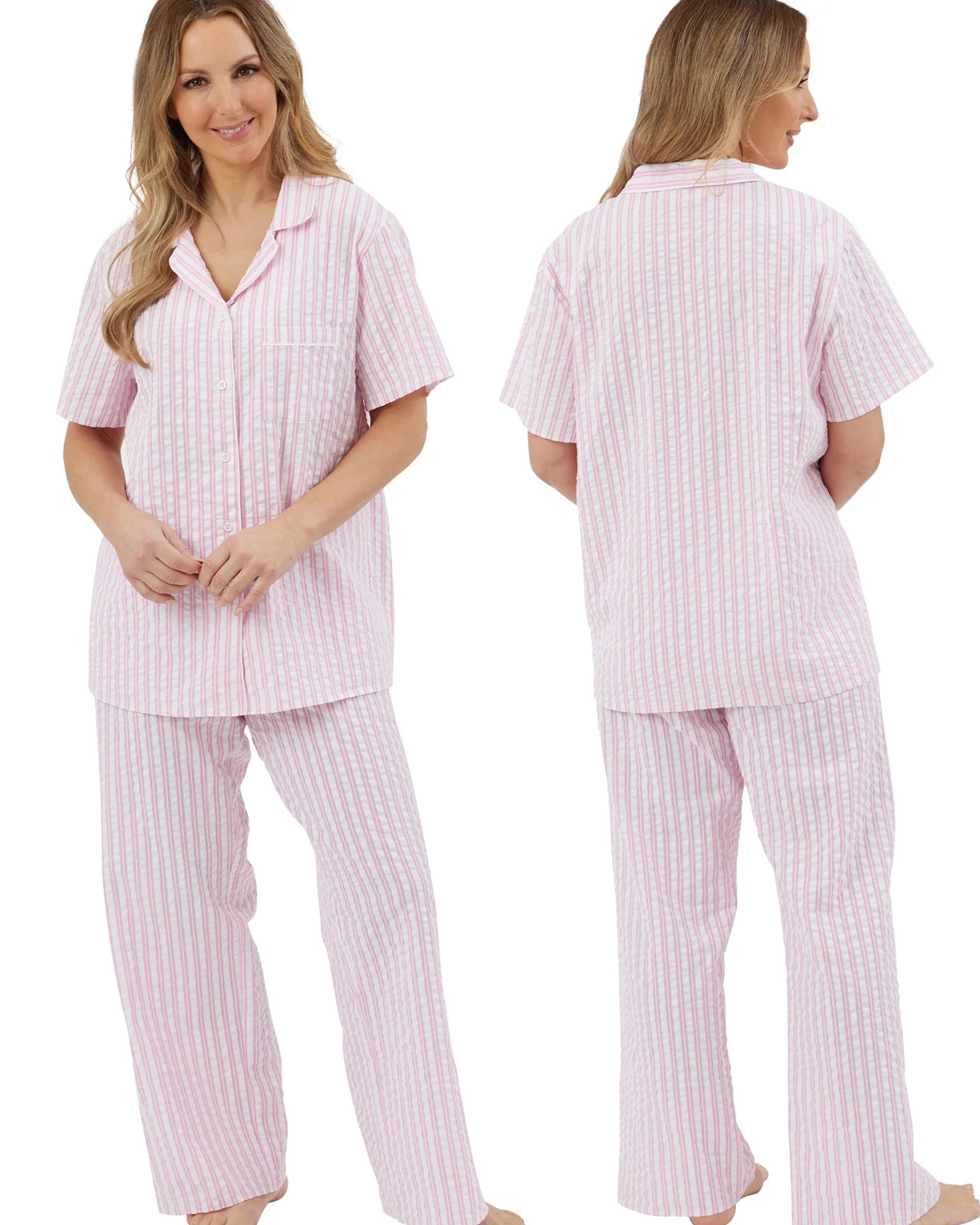 Pink 'Coastal Stripe' 100% cotton seersucker short sleeve pyjamas