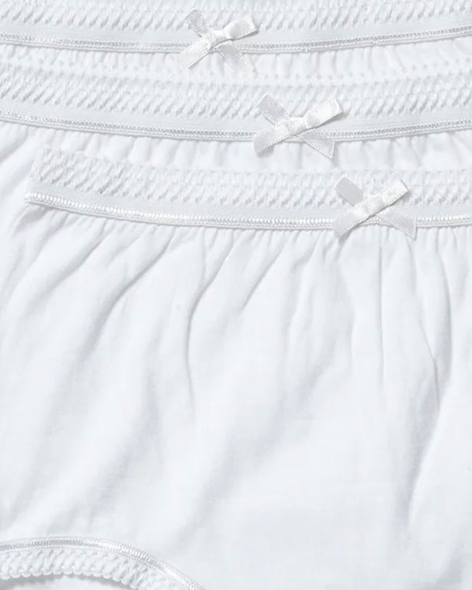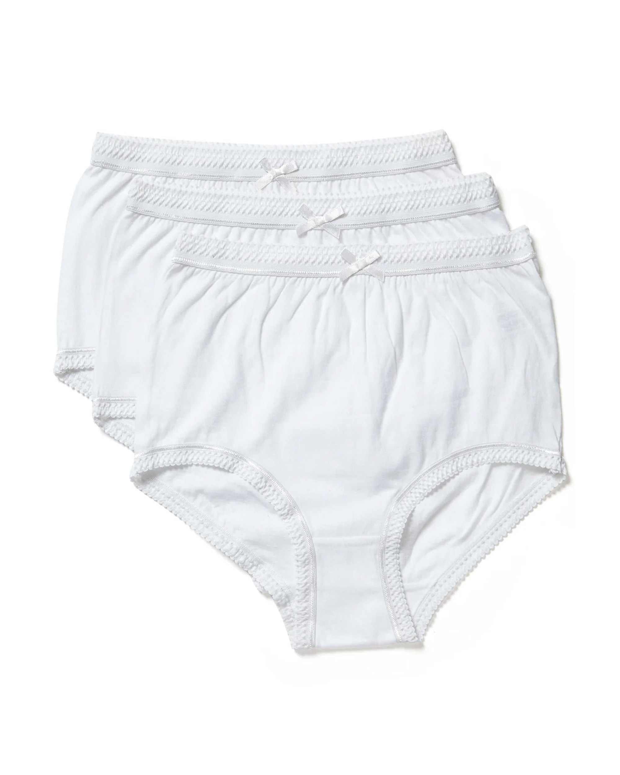 3 pair pack of full knickers. Made with 100% soft cotton jersey and gentle elastic trims. Featuring a high rise design, low cut legs and ample backside coverage.
